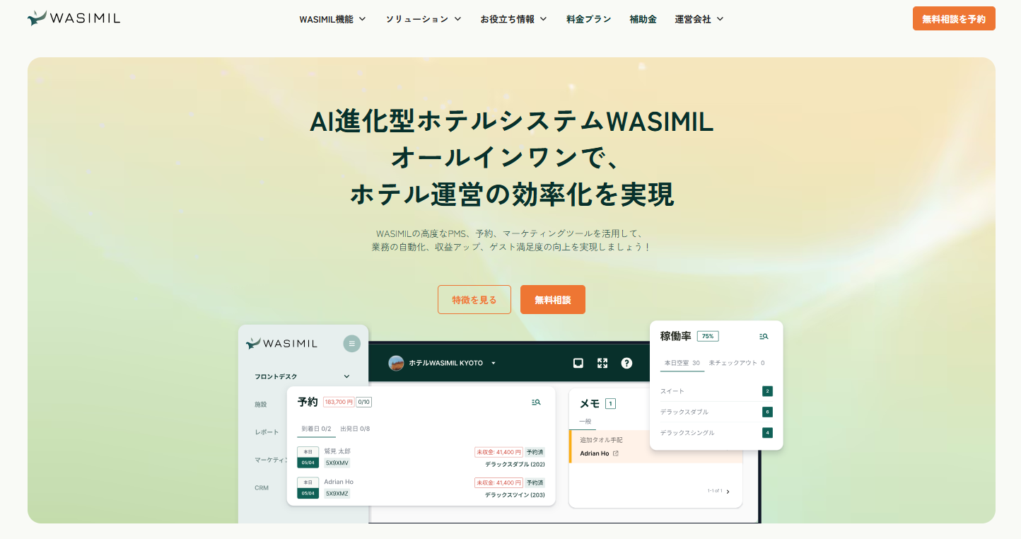 ホテル運営に必要な機能をすべて備えたオールインワン型のシステム「WASIMIL」の開発・提供